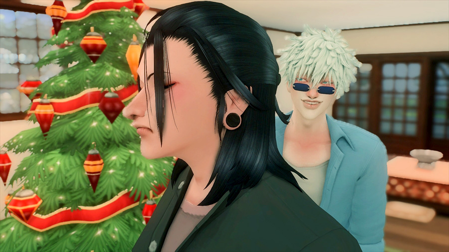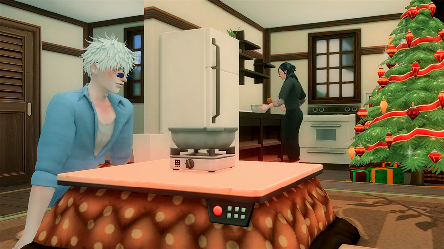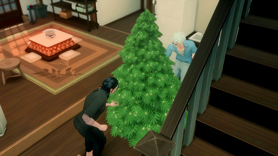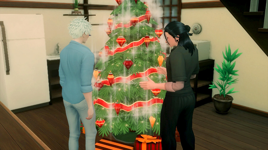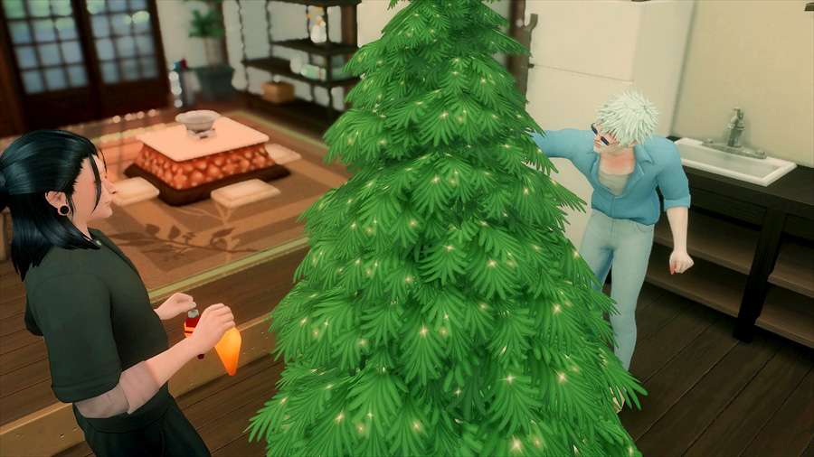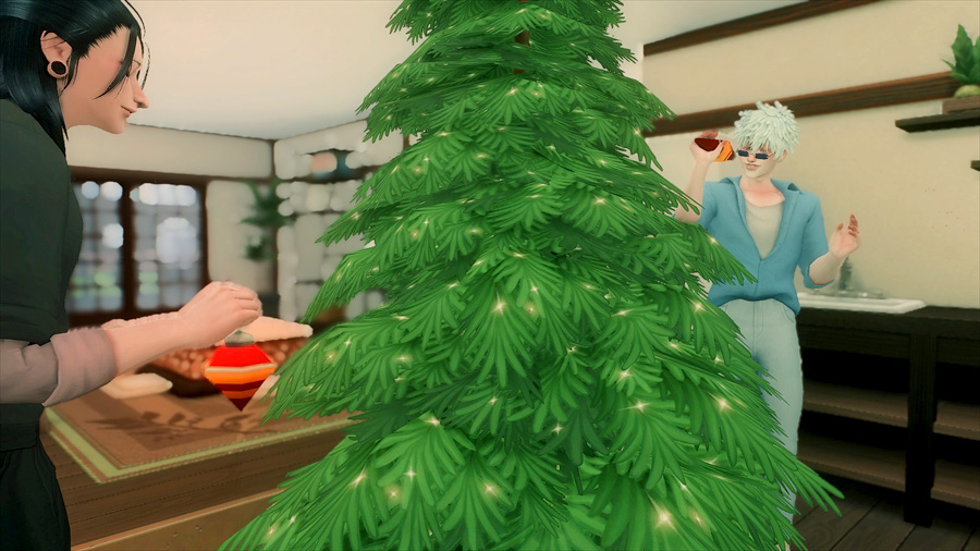 ゲーム内は冬でこの日はクリスマスで色々やろうと思えば華やかにできたのですが全然準備ができておらず、キッチンで適当にクリスマスツリーを飾る感じになってしまいました。