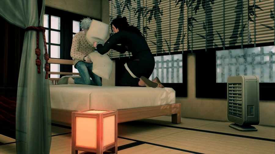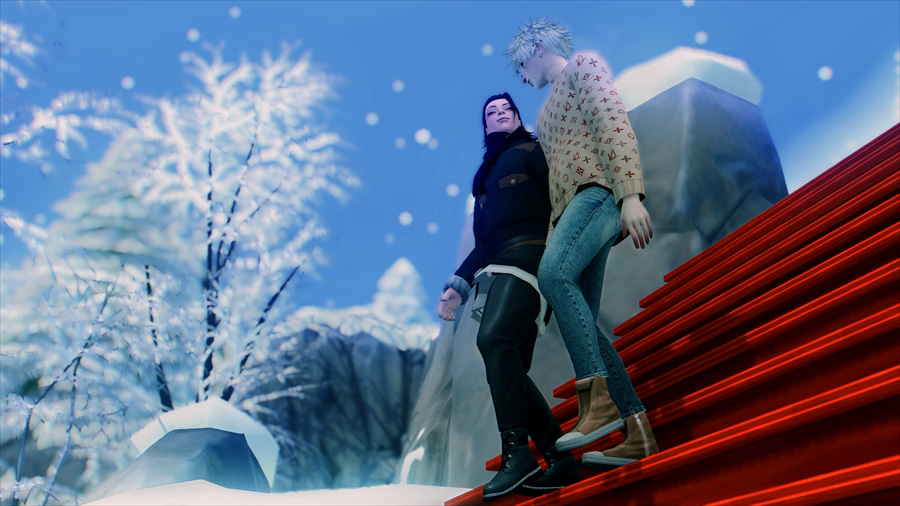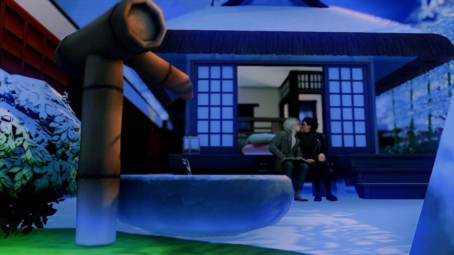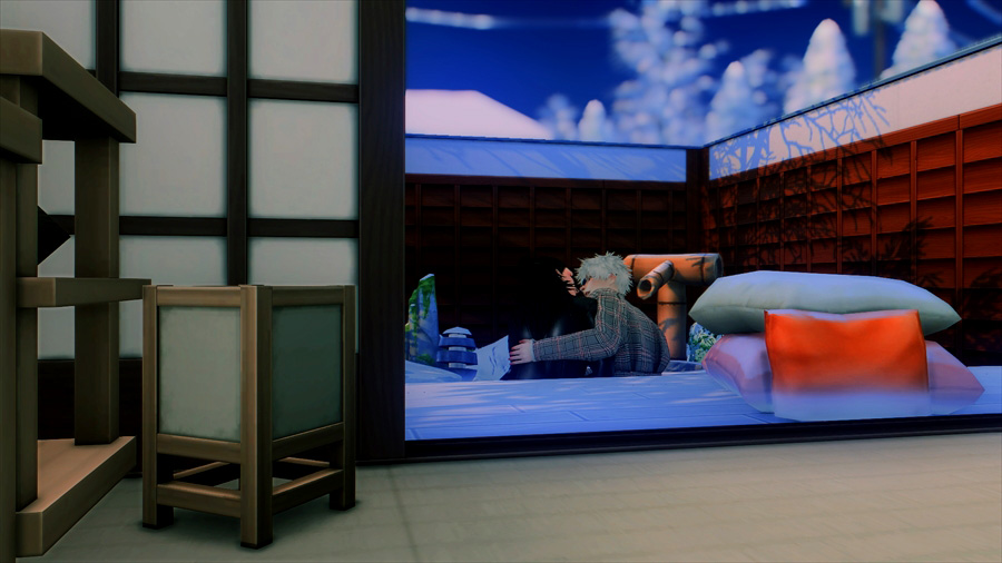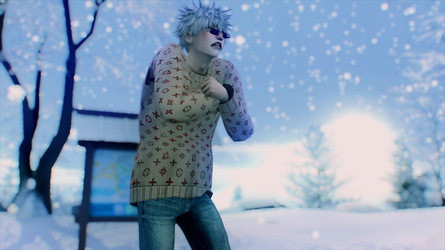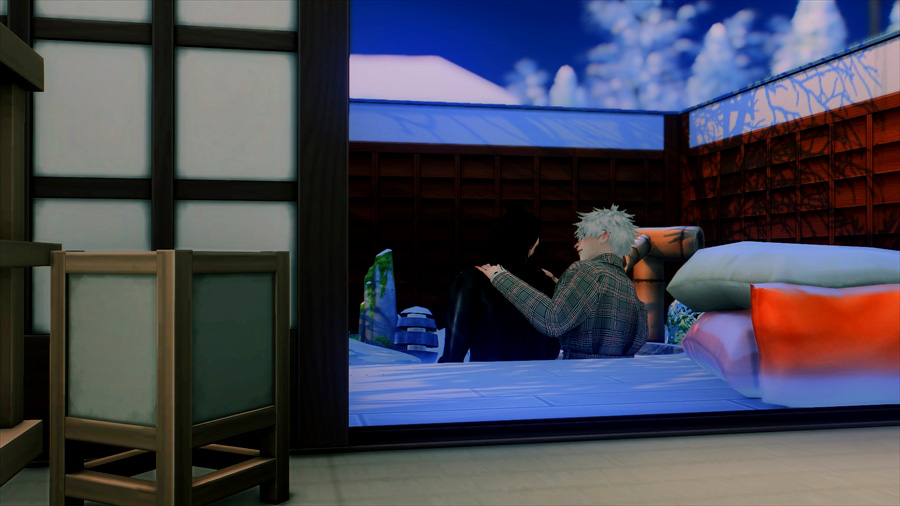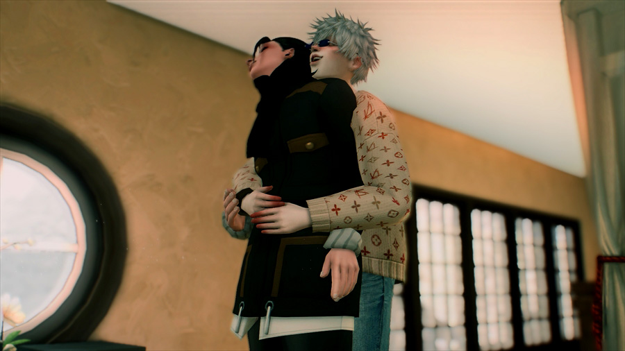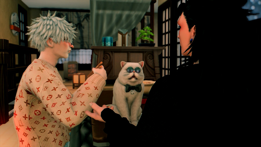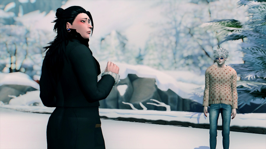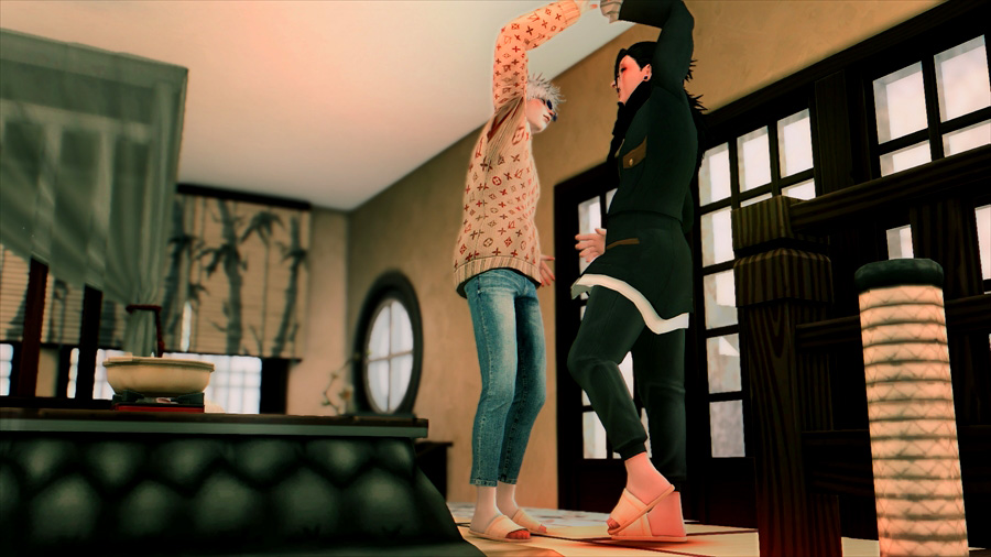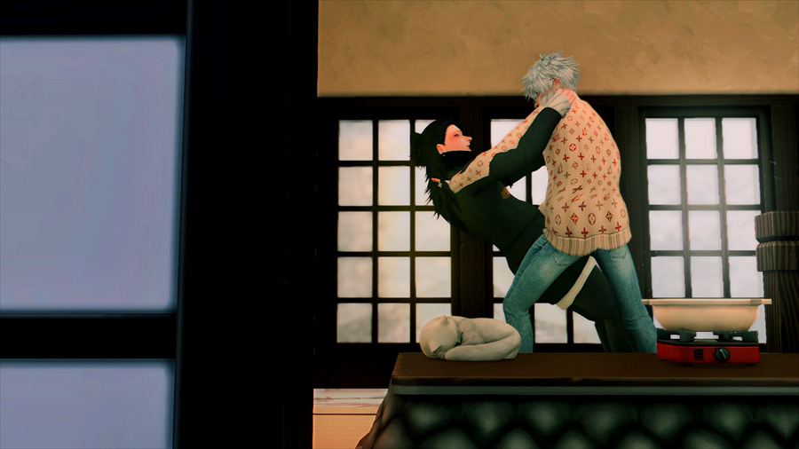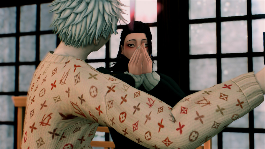 吹雪いてきたので散策を中止して慌てて旅館に戻りました。暖炉の前であったか~いってやってるのですが、悟は完全に傑の尻で温まろうとしている。