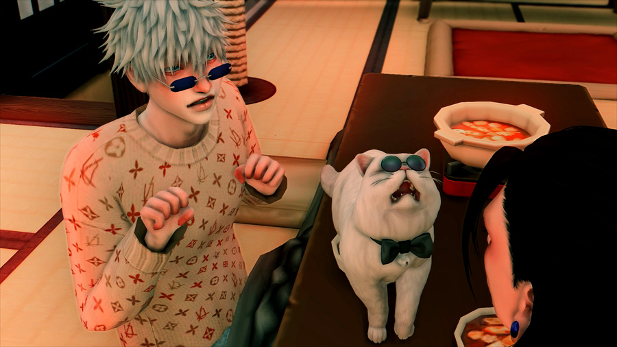 Sims4には机の上で暴れても物が倒れるなどという挙動は実装されていないので「ご飯がこぼれる!」的な状態に見えても特に問題なく暴れることが出来ます。
